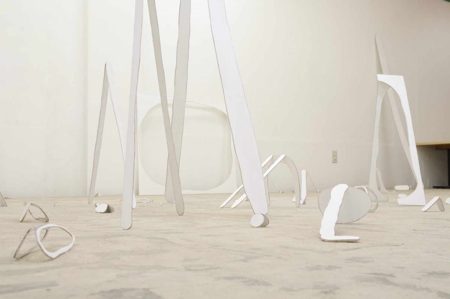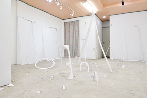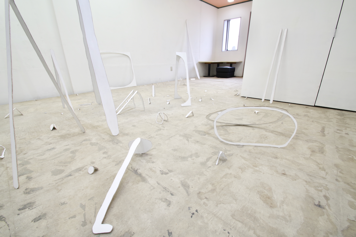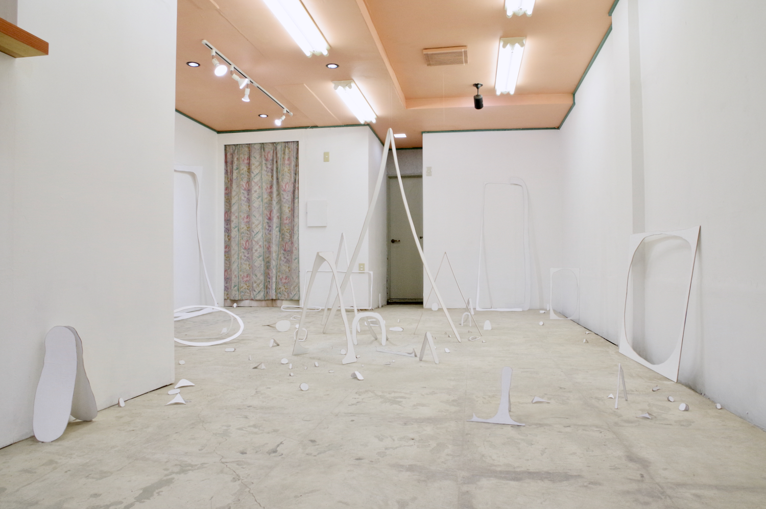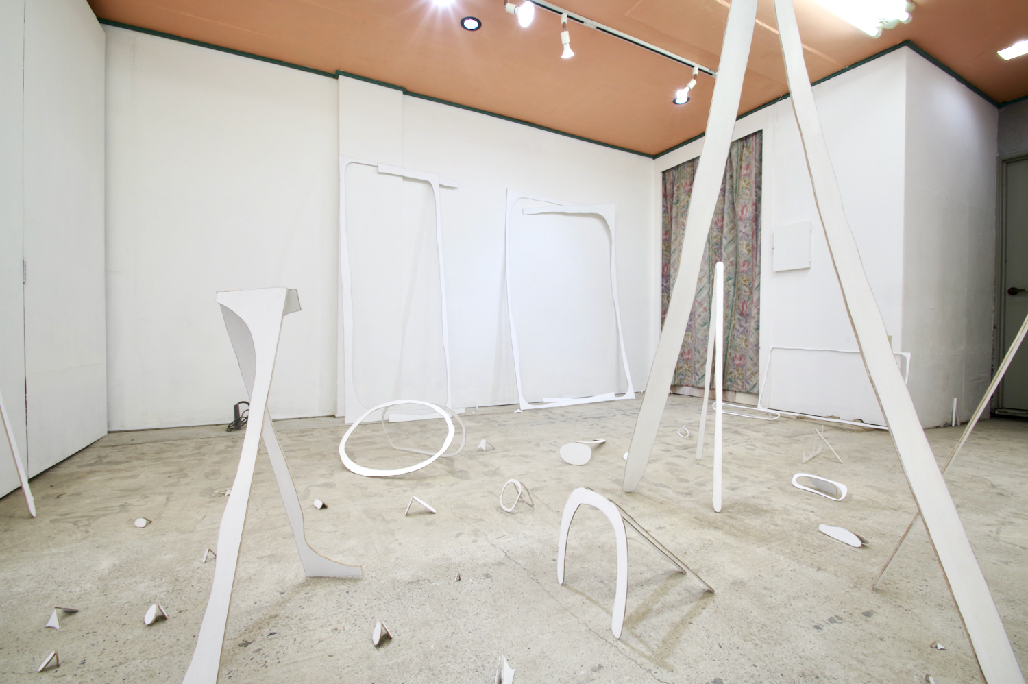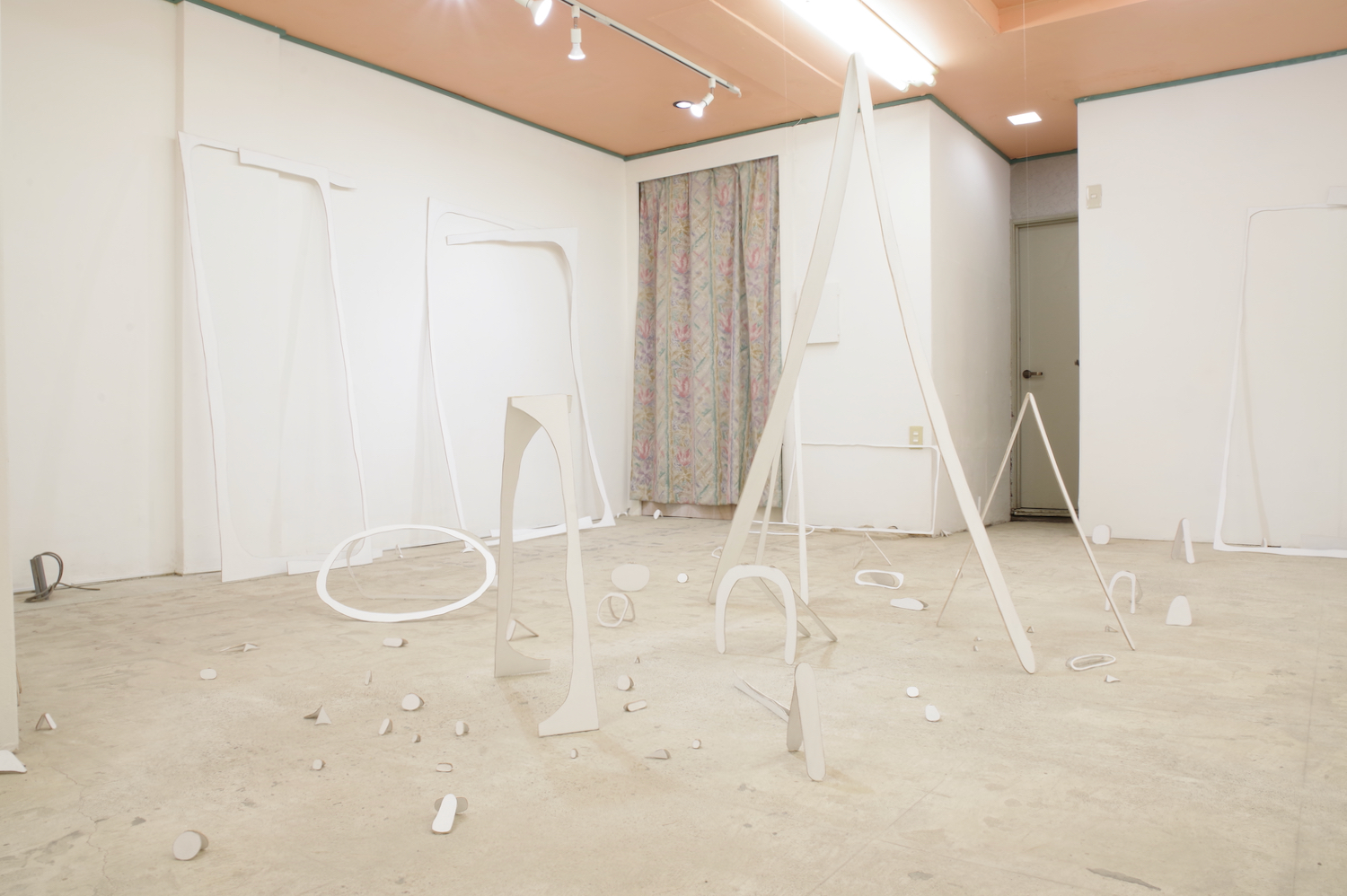 今年の夏は急に空が暗くなったと思えば、分厚い雲からゴロゴロと音がし始めることが多かった。 雲の間から落ちる雷を見てみると、それは鋭利なギザギザではなく、へろへろとしたサツマイモの根っこのような細い線で、そういえばこんな感じだったなと再確認する。 あのへろへろは、静止画として捉えれば貧弱そうな印象を受けるが、実際は本来通過が難しい「空気」のなかを、膨大な力によって押し通ったりぶつかったりしながら形作られている。普段見ることや意識することのない「空気」が、雷によって浮かび上がり、また雷も雷らしさを形づけられている。 堀田のペインティングは、初期の頃描かれていた漫画的モチーフから現在までの変化をみると、もともとあるモチーフから要素だけを選んで抽象化していくような作業ではなく、彫刻のようにガリガリと削り去って形を残すような手法をとっているように見える。 それは自らの身体性を用いて絵を描くという自明な動作を用いることではなく、実はその身体のあり方を形成する、図と地でいうところの地である「空気」を作り出しているのではないだろうか。 今回の「からです」という展覧会タイトルは、始まりを示す「~(から)」と「空(から)っぽ」と2つの意味を読み解くことができる。 どちらもゼロの状態としての「無」を想起させる。堀田が描画の際に用いる白は、そのような「無」を象徴するような素材のように思わせる。 捉えがたい存在を得ようとする時、自分の身体をいかにコントロールできるか、それをこの空間でみせてくれるのかもしれない。