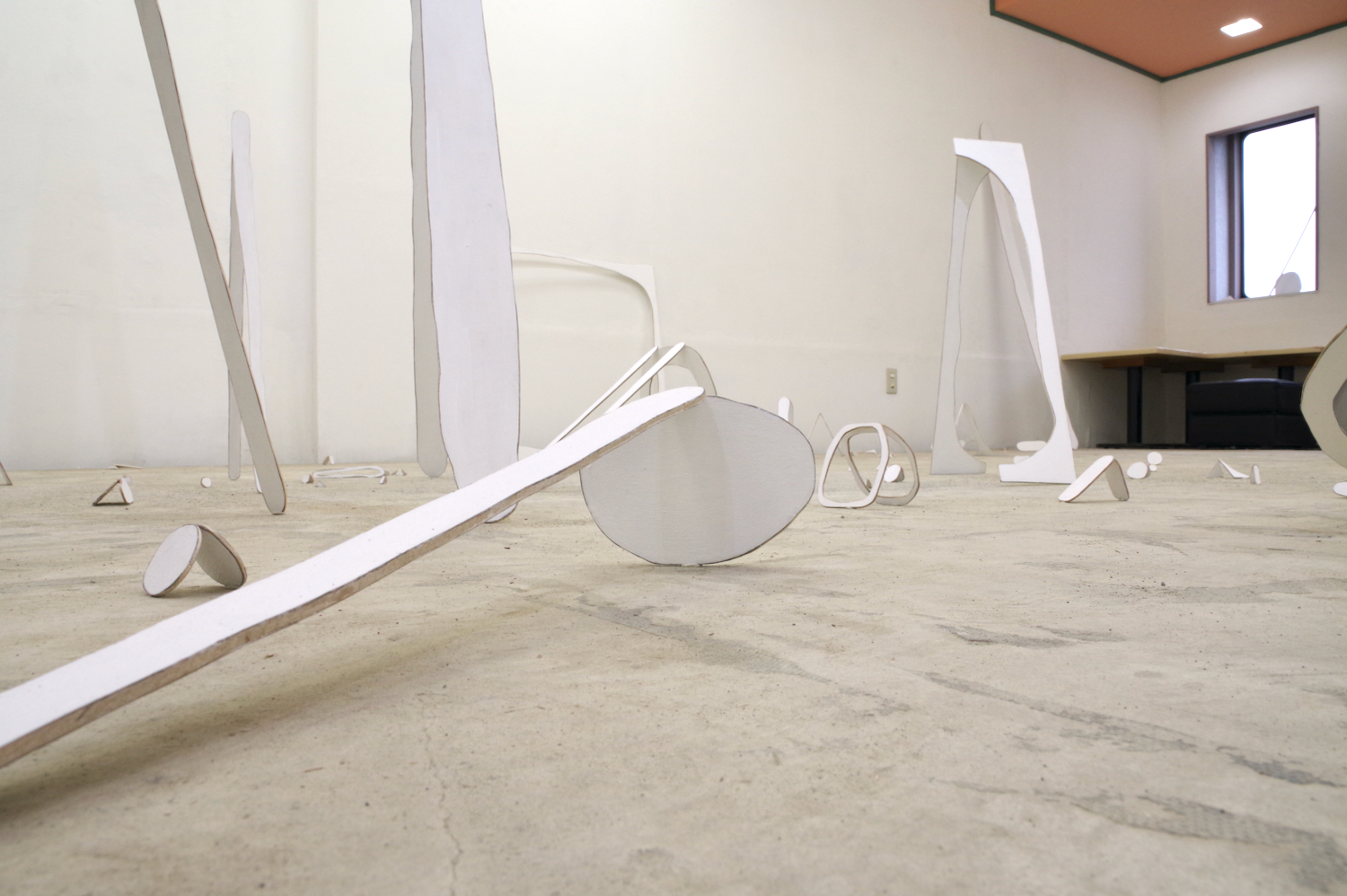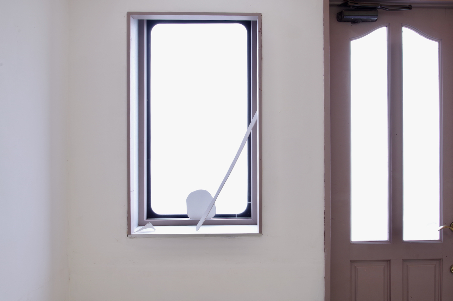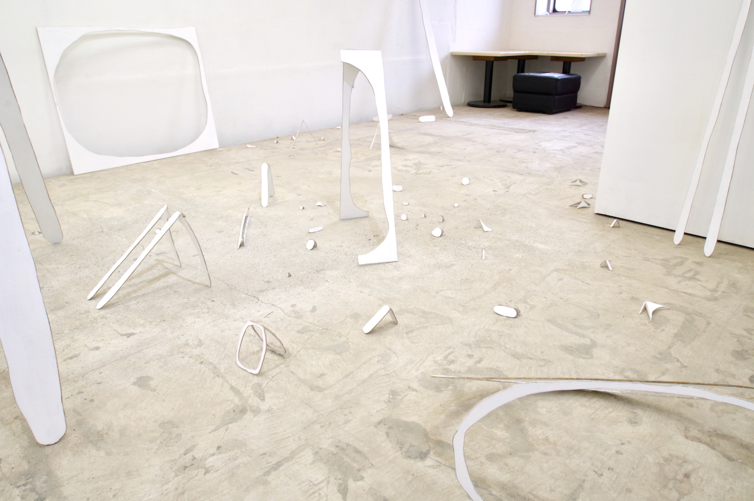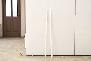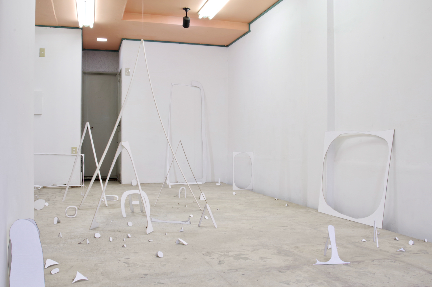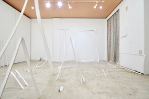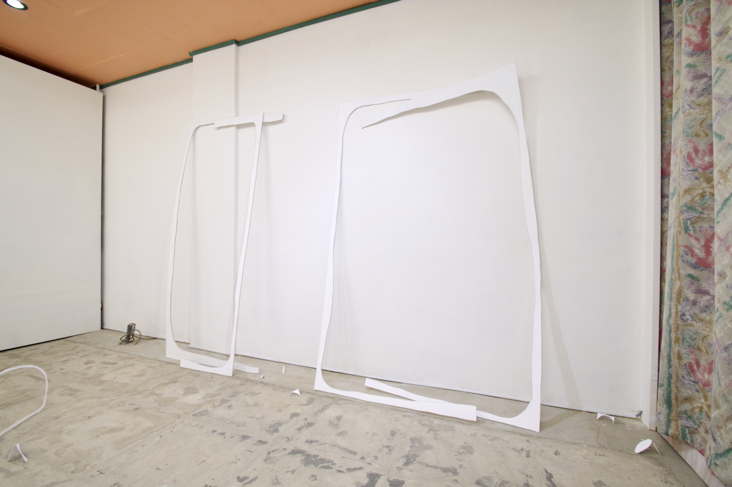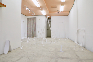 今年の夏は急に空が暗くなったと思えば、分厚い雲からゴロゴロと音がし始めることが多かった。 雲の間から落ちる雷を見てみると、それは鋭利なギザギザではなく、へろへろとしたサツマイモの根っこのような細い線で、そういえばこんな感じだったなと再確認する。 あのへろへろは、静止画として捉えれば貧弱そうな印象を受けるが、実際は本来通過が難しい「空気」のなかを、膨大な力によって押し通ったりぶつかったりしながら形作られている。普段見ることや意識することのない「空気」が、雷によって浮かび上がり、また雷も雷らしさを形づけられている。 堀田のペインティングは、初期の頃描かれていた漫画的モチーフから現在までの変化をみると、もともとあるモチーフから要素だけを選んで抽象化していくような作業ではなく、彫刻のようにガリガリと削り去って形を残すような手法をとっているように見える。 それは自らの身体性を用いて絵を描くという自明な動作を用いることではなく、実はその身体のあり方を形成する、図と地でいうところの地である「空気」を作り出しているのではないだろうか。 今回の「からです」という展覧会タイトルは、始まりを示す「~(から)」と「空(から)っぽ」と2つの意味を読み解くことができる。 どちらもゼロの状態としての「無」を想起させる。堀田が描画の際に用いる白は、そのような「無」を象徴するような素材のように思わせる。 捉えがたい存在を得ようとする時、自分の身体をいかにコントロールできるか、それをこの空間でみせてくれるのかもしれない。