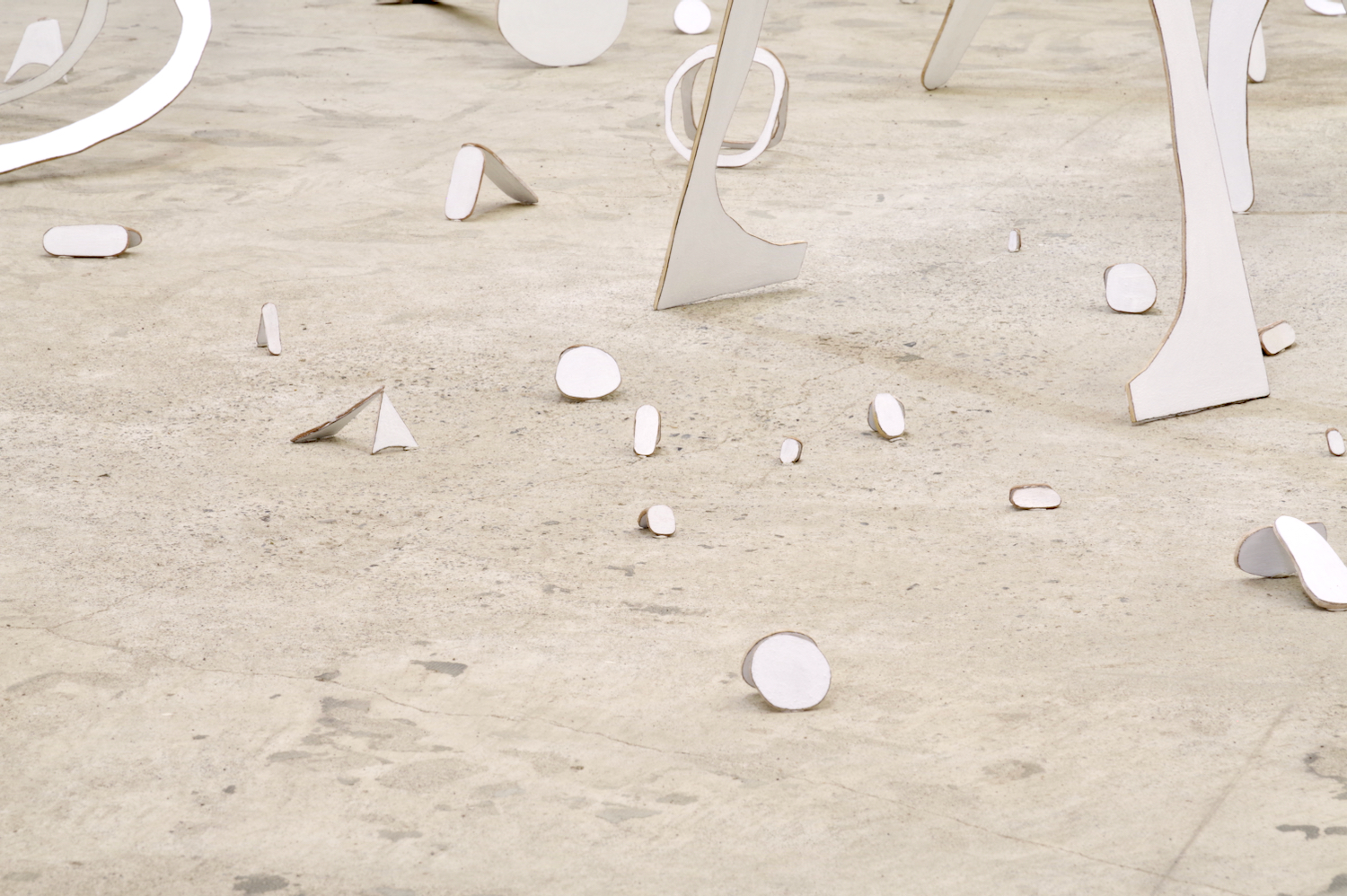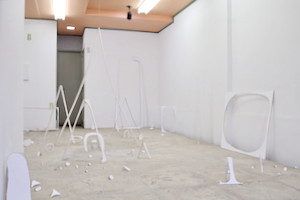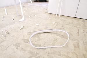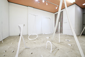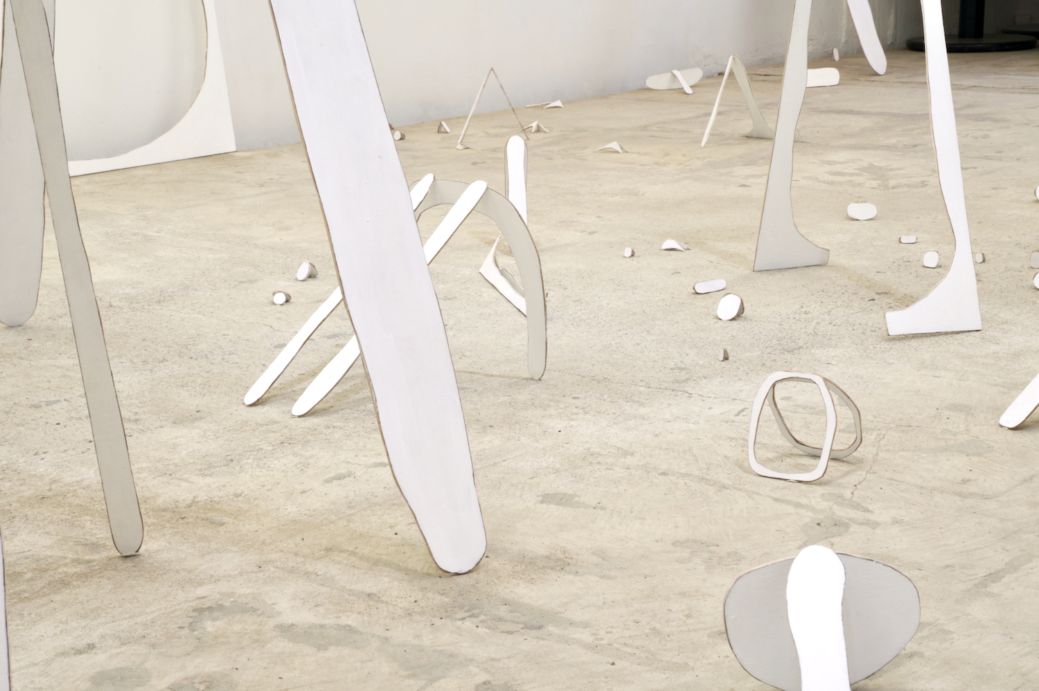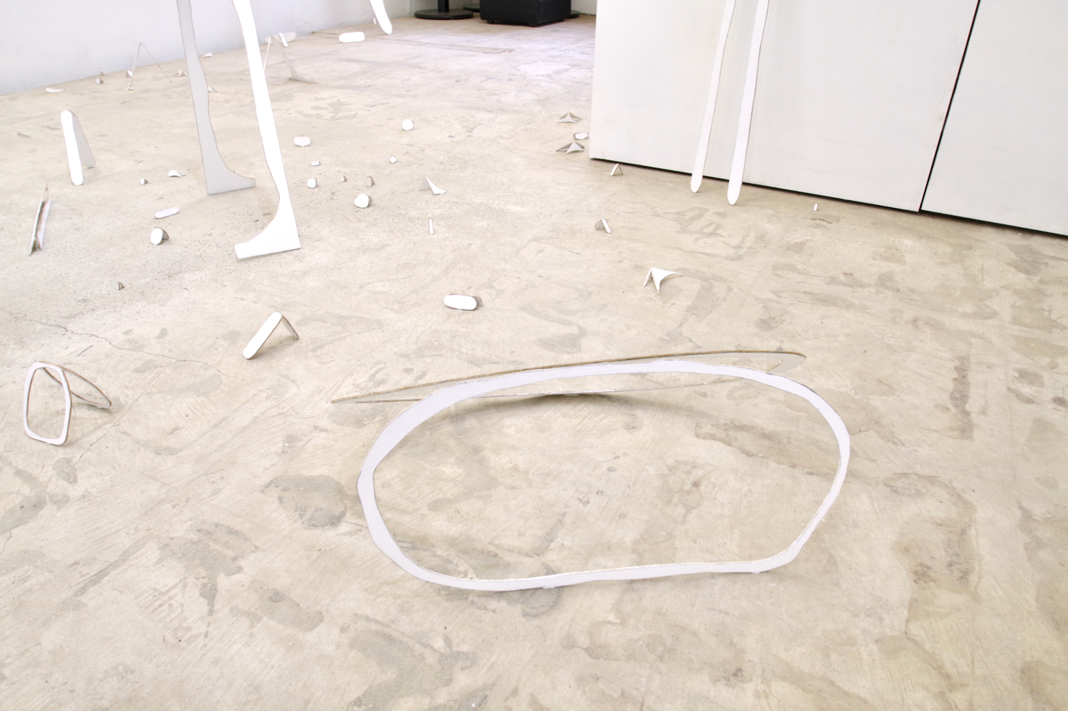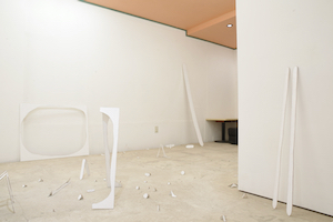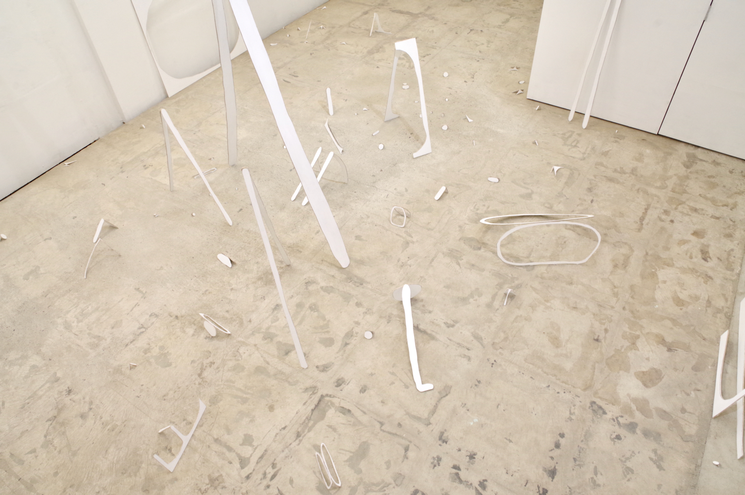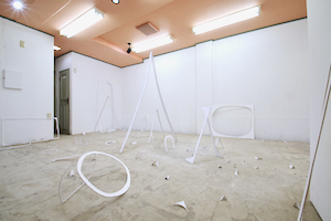 今年の夏は急に空が暗くなったと思えば、分厚い雲からゴロゴロと音がし始めることが多かった。 雲の間から落ちる雷を見てみると、それは鋭利なギザギザではなく、へろへろとしたサツマイモの根っこのような細い線で、そういえばこんな感じだったなと再確認する。 あのへろへろは、静止画として捉えれば貧弱そうな印象を受けるが、実際は本来通過が難しい「空気」のなかを、膨大な力によって押し通ったりぶつかったりしながら形作られている。普段見ることや意識することのない「空気」が、雷によって浮かび上がり、また雷も雷らしさを形づけられている。 堀田のペインティングは、初期の頃描かれていた漫画的モチーフから現在までの変化をみると、もともとあるモチーフから要素だけを選んで抽象化していくような作業ではなく、彫刻のようにガリガリと削り去って形を残すような手法をとっているように見える。 それは自らの身体性を用いて絵を描くという自明な動作を用いることではなく、実はその身体のあり方を形成する、図と地でいうところの地である「空気」を作り出しているのではないだろうか。 今回の「からです」という展覧会タイトルは、始まりを示す「~(から)」と「空(から)っぽ」と2つの意味を読み解くことができる。 どちらもゼロの状態としての「無」を想起させる。堀田が描画の際に用いる白は、そのような「無」を象徴するような素材のように思わせる。 捉えがたい存在を得ようとする時、自分の身体をいかにコントロールできるか、それをこの空間でみせてくれるのかもしれない。