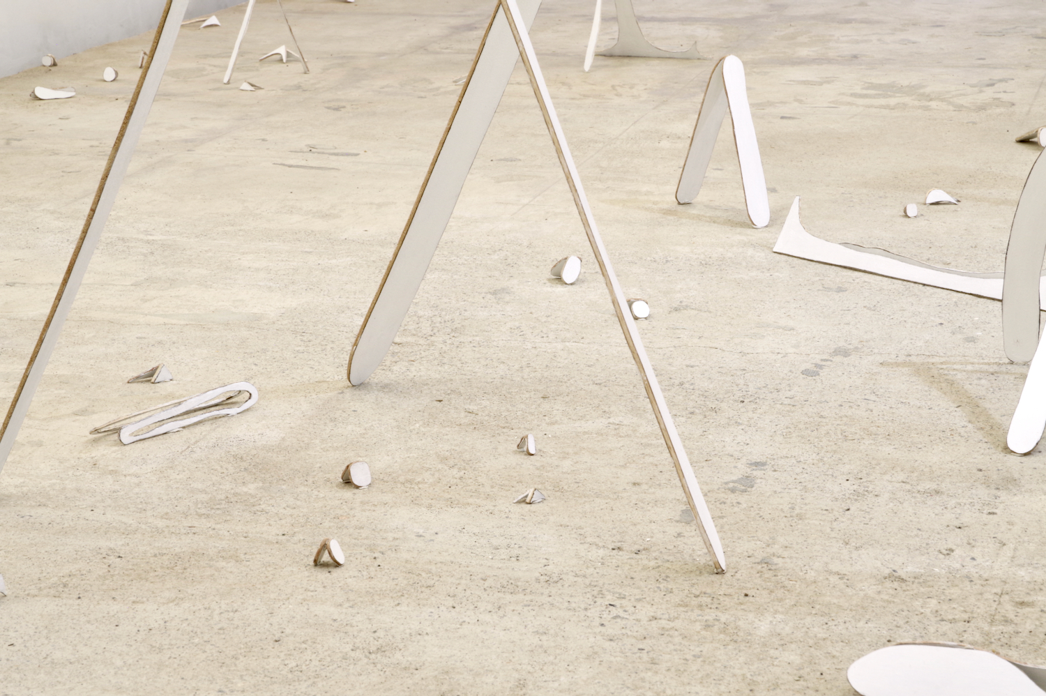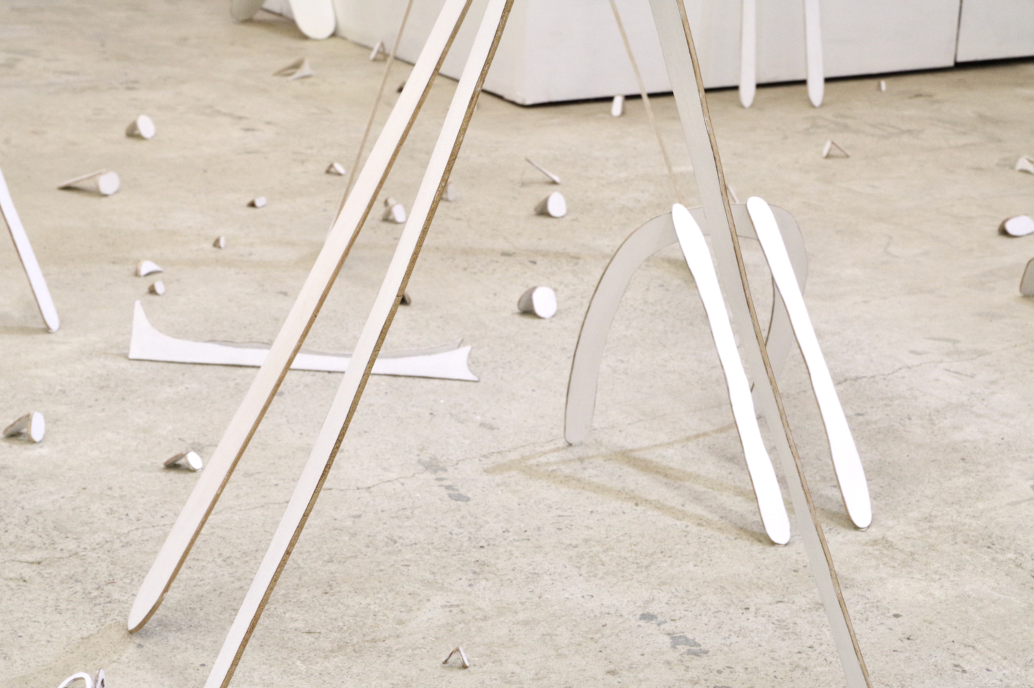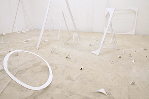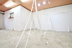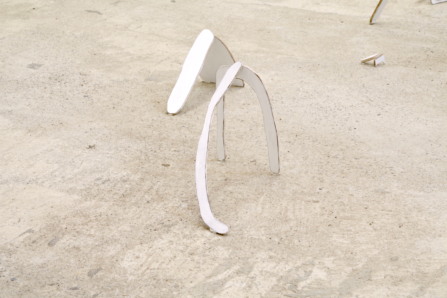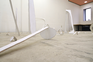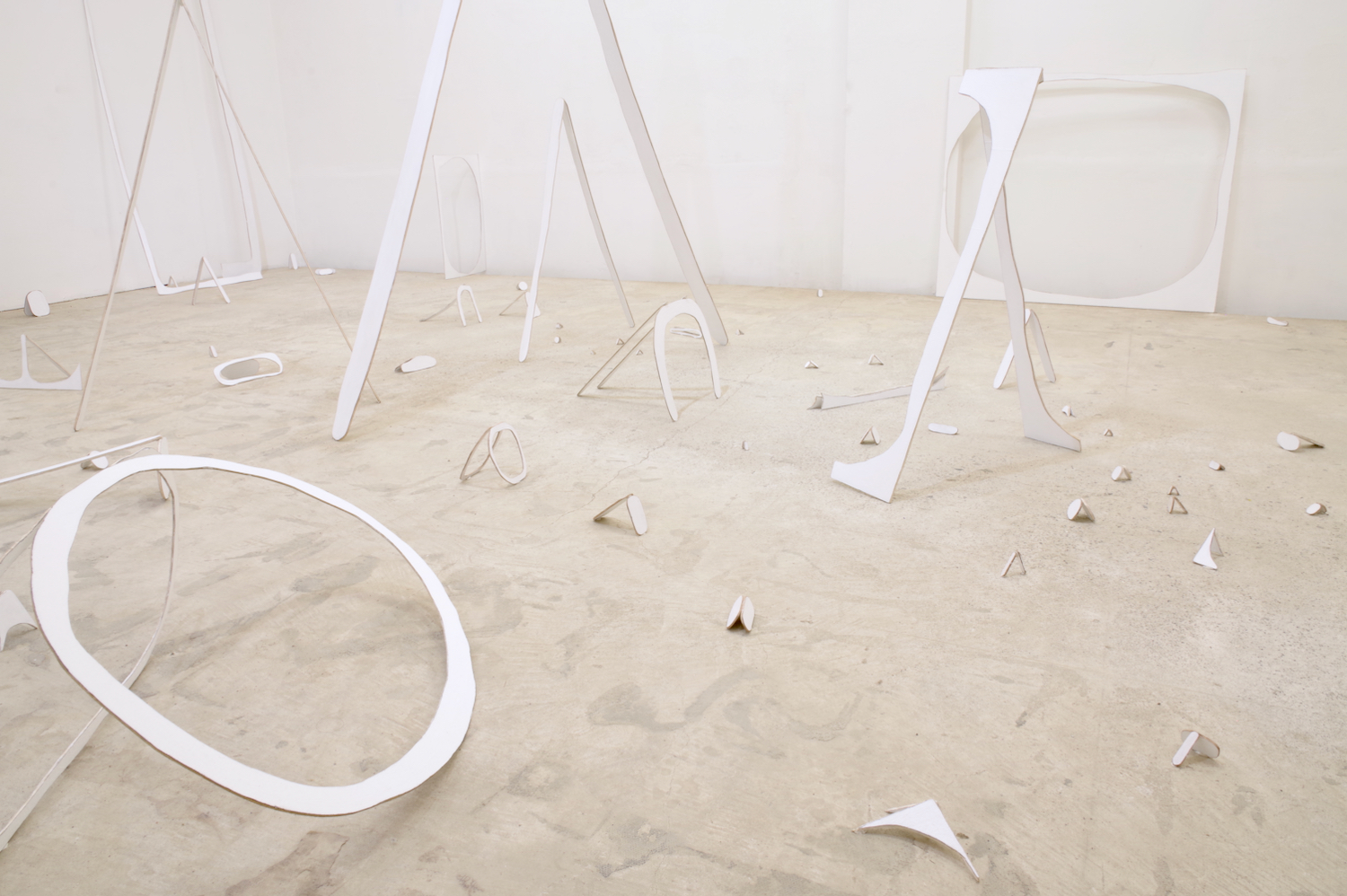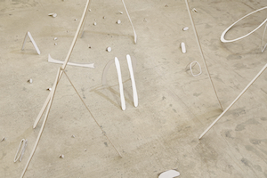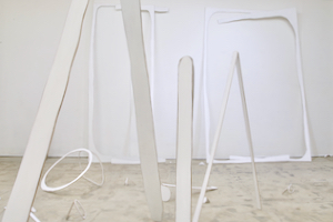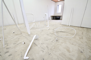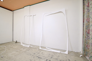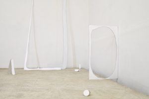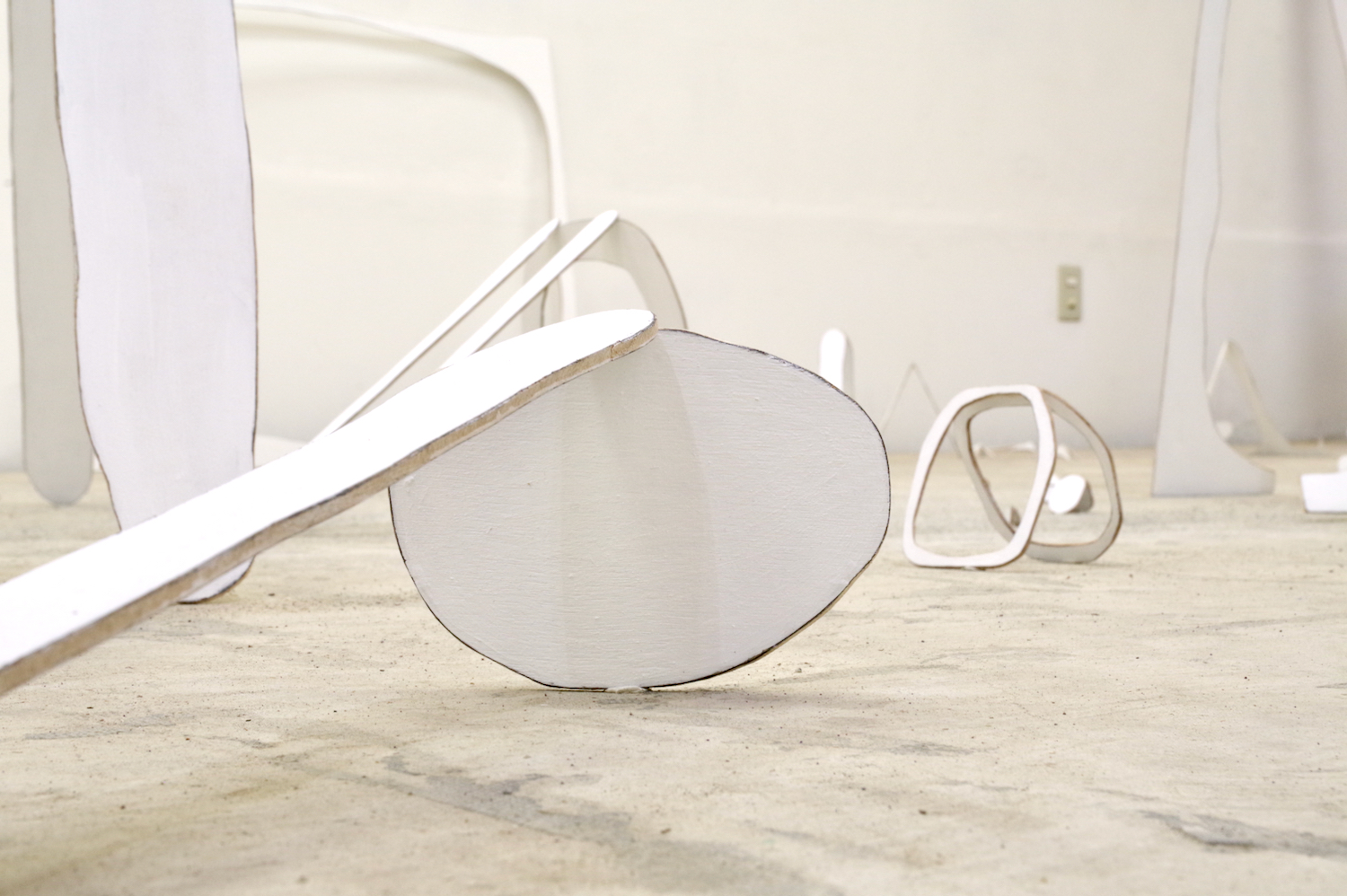 今年の夏は急に空が暗くなったと思えば、分厚い雲からゴロゴロと音がし始めることが多かった。 雲の間から落ちる雷を見てみると、それは鋭利なギザギザではなく、へろへろとしたサツマイモの根っこのような細い線で、そういえばこんな感じだったなと再確認する。 あのへろへろは、静止画として捉えれば貧弱そうな印象を受けるが、実際は本来通過が難しい「空気」のなかを、膨大な力によって押し通ったりぶつかったりしながら形作られている。普段見ることや意識することのない「空気」が、雷によって浮かび上がり、また雷も雷らしさを形づけられている。 堀田のペインティングは、初期の頃描かれていた漫画的モチーフから現在までの変化をみると、もともとあるモチーフから要素だけを選んで抽象化していくような作業ではなく、彫刻のようにガリガリと削り去って形を残すような手法をとっているように見える。 それは自らの身体性を用いて絵を描くという自明な動作を用いることではなく、実はその身体のあり方を形成する、図と地でいうところの地である「空気」を作り出しているのではないだろうか。 今回の「からです」という展覧会タイトルは、始まりを示す「~(から)」と「空(から)っぽ」と2つの意味を読み解くことができる。 どちらもゼロの状態としての「無」を想起させる。堀田が描画の際に用いる白は、そのような「無」を象徴するような素材のように思わせる。 捉えがたい存在を得ようとする時、自分の身体をいかにコントロールできるか、それをこの空間でみせてくれるのかもしれない。