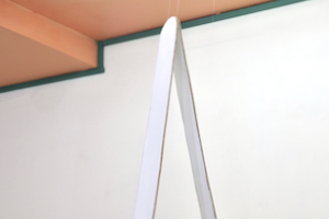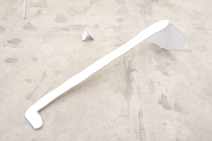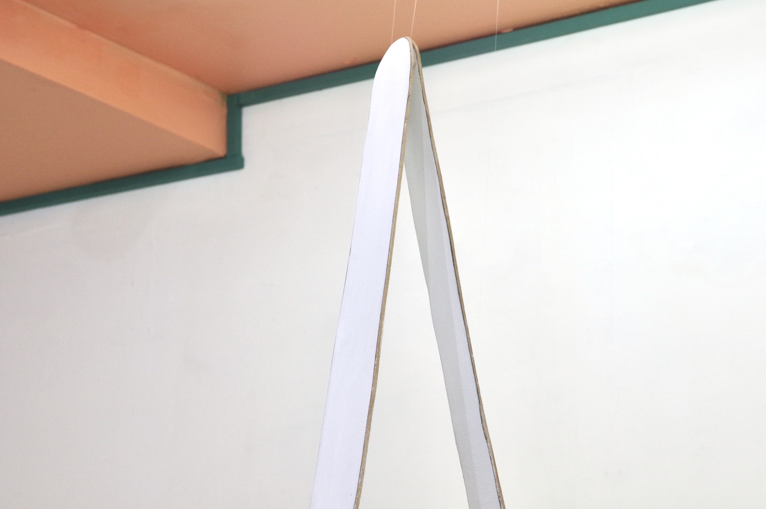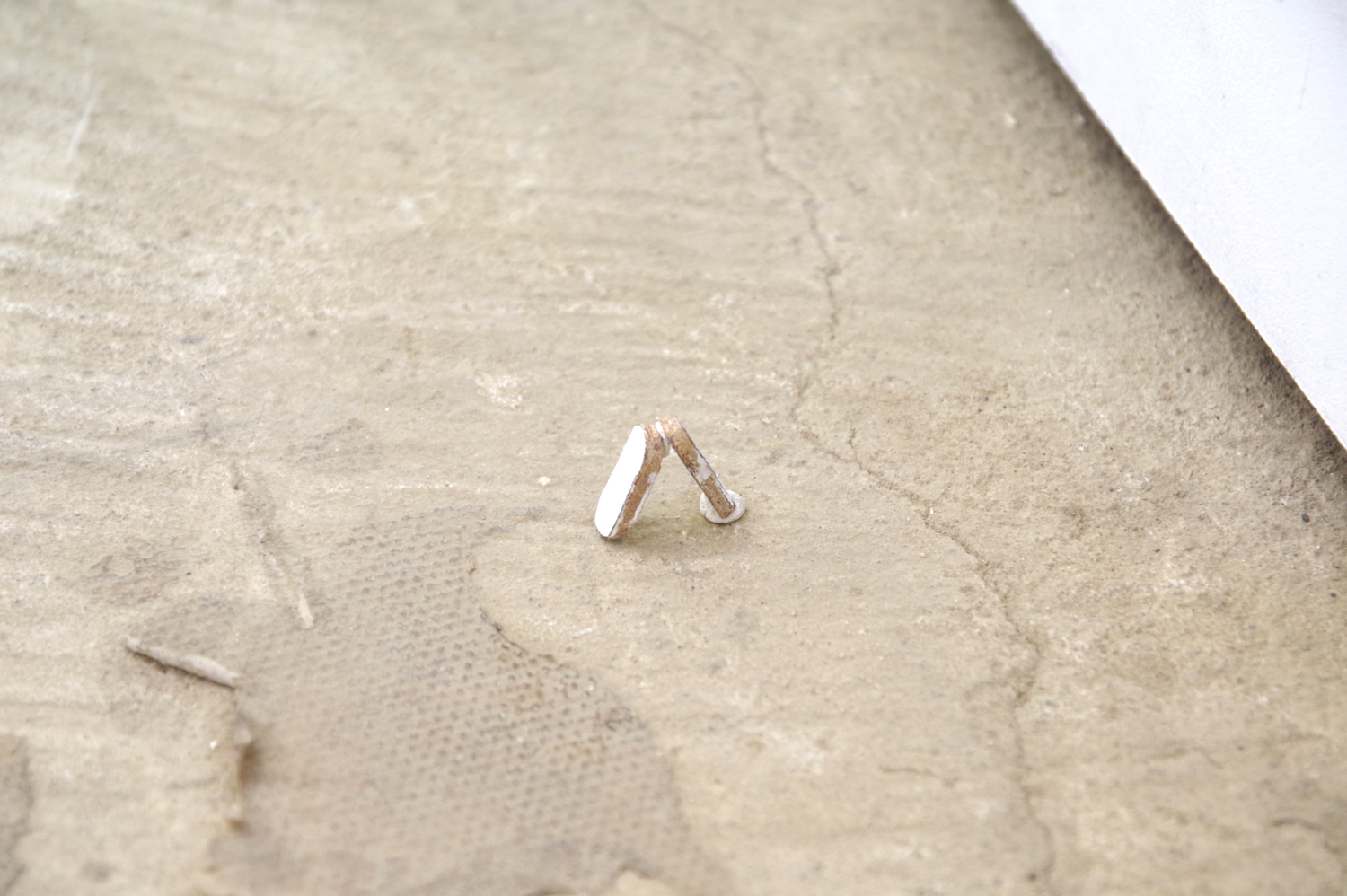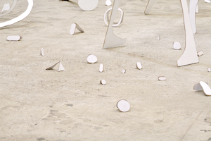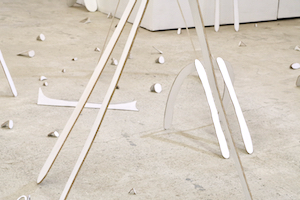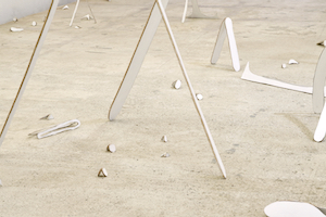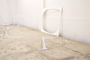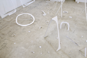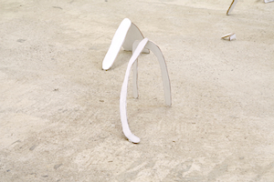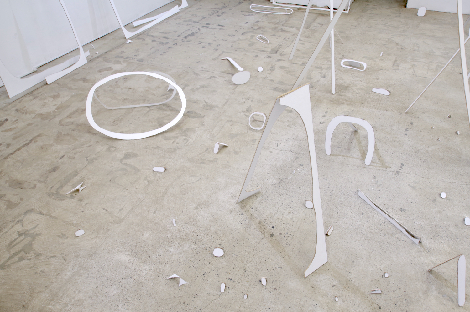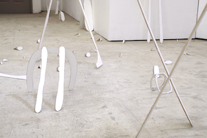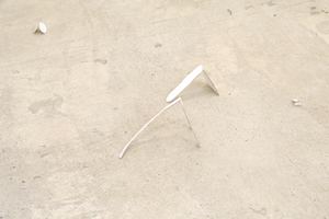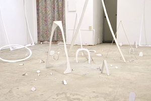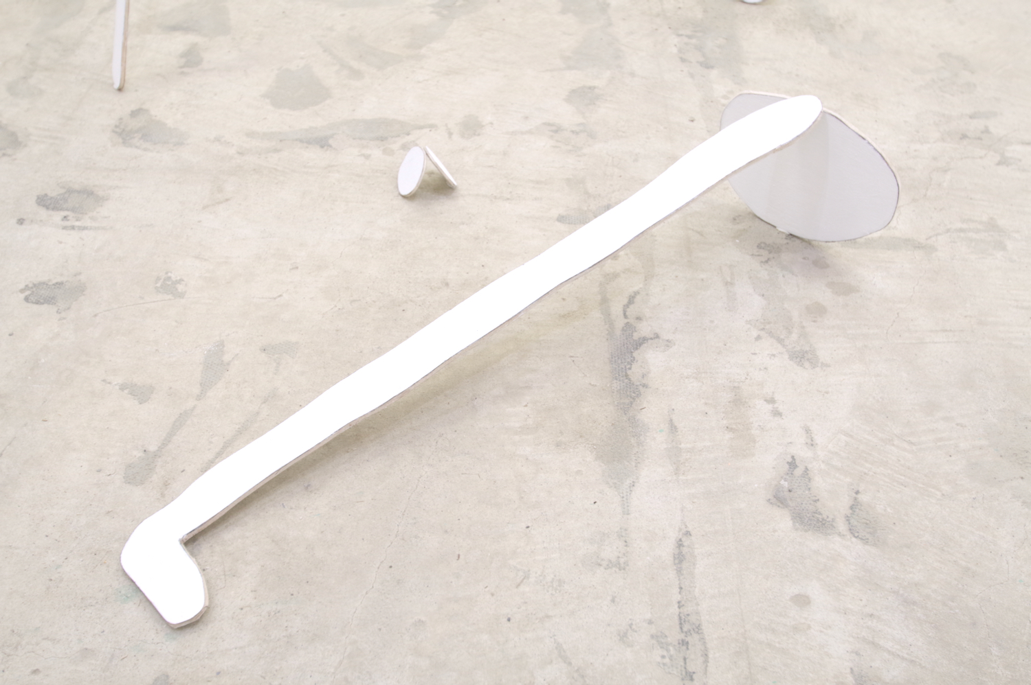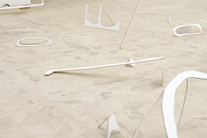 今年の夏は急に空が暗くなったと思えば、分厚い雲からゴロゴロと音がし始めることが多かった。 雲の間から落ちる雷を見てみると、それは鋭利なギザギザではなく、へろへろとしたサツマイモの根っこのような細い線で、そういえばこんな感じだったなと再確認する。 あのへろへろは、静止画として捉えれば貧弱そうな印象を受けるが、実際は本来通過が難しい「空気」のなかを、膨大な力によって押し通ったりぶつかったりしながら形作られている。普段見ることや意識することのない「空気」が、雷によって浮かび上がり、また雷も雷らしさを形づけられている。 堀田のペインティングは、初期の頃描かれていた漫画的モチーフから現在までの変化をみると、もともとあるモチーフから要素だけを選んで抽象化していくような作業ではなく、彫刻のようにガリガリと削り去って形を残すような手法をとっているように見える。 それは自らの身体性を用いて絵を描くという自明な動作を用いることではなく、実はその身体のあり方を形成する、図と地でいうところの地である「空気」を作り出しているのではないだろうか。 今回の「からです」という展覧会タイトルは、始まりを示す「~(から)」と「空(から)っぽ」と2つの意味を読み解くことができる。 どちらもゼロの状態としての「無」を想起させる。堀田が描画の際に用いる白は、そのような「無」を象徴するような素材のように思わせる。 捉えがたい存在を得ようとする時、自分の身体をいかにコントロールできるか、それをこの空間でみせてくれるのかもしれない。